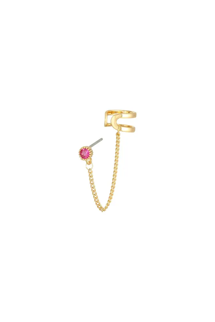 Wauw, hoe leuk is deze stud met earcuff? Dit roze steentje en earcuff zitten met een ketting aan elkaar vast, en maakt jouw look helemaal af!